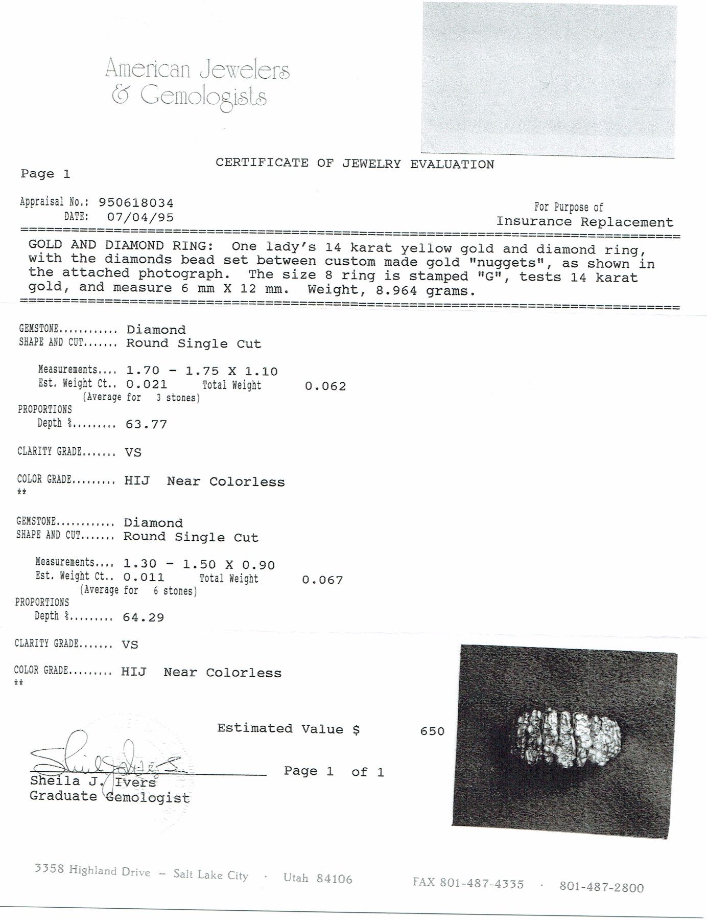 Sz10 14kt Gold Nugget Ring Appraisal Included
