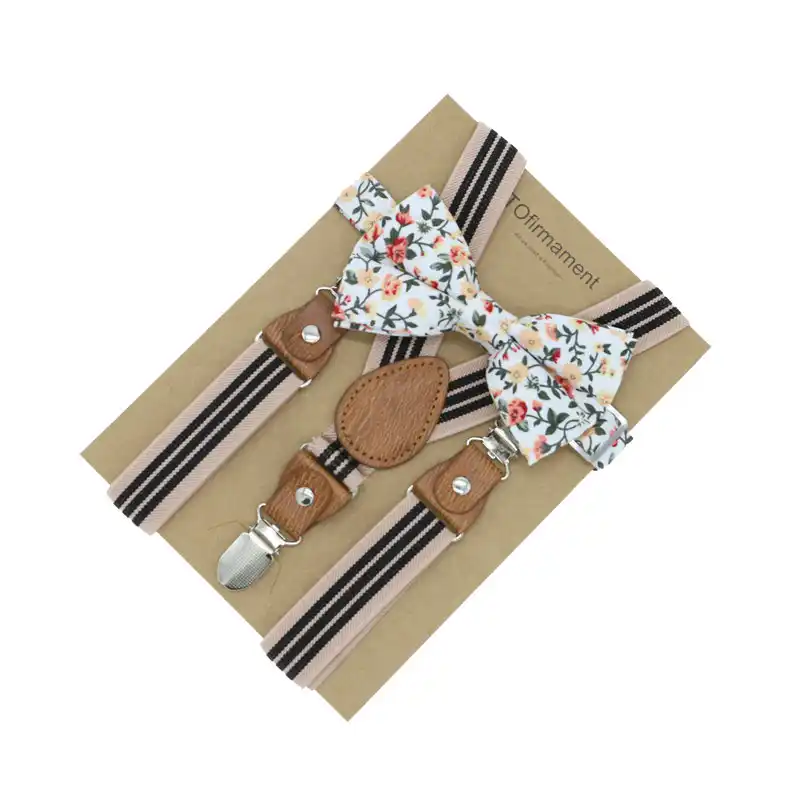Brown Leather Suspenders Beige Bow Tie In 2020 Casual Groomsmen Attire Khaki Groomsmen Groomsmen Attire Khaki