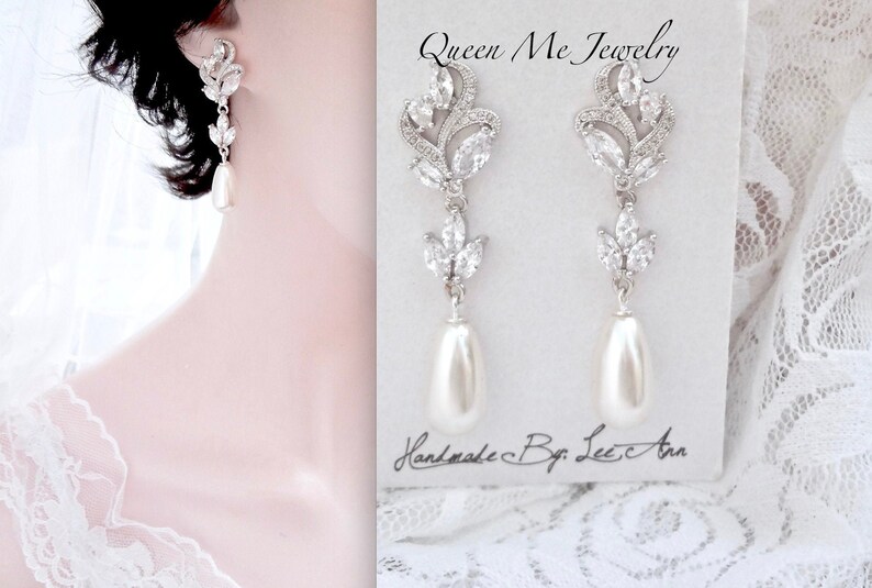 Long Pearl Drop Wedding Earrings For A Bride Cz Leaf Dangle Etsy