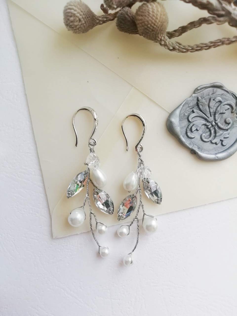 Crystal Leaf And Pearl Wedding Earrings In Bridal White Bishboshbecca