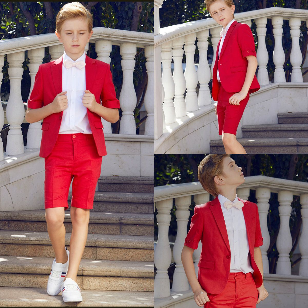 Boy Ring Bearer Outfit Ivory Silk With Red Shorts Three Quarter Sleeves Golositos Ropa Infantil