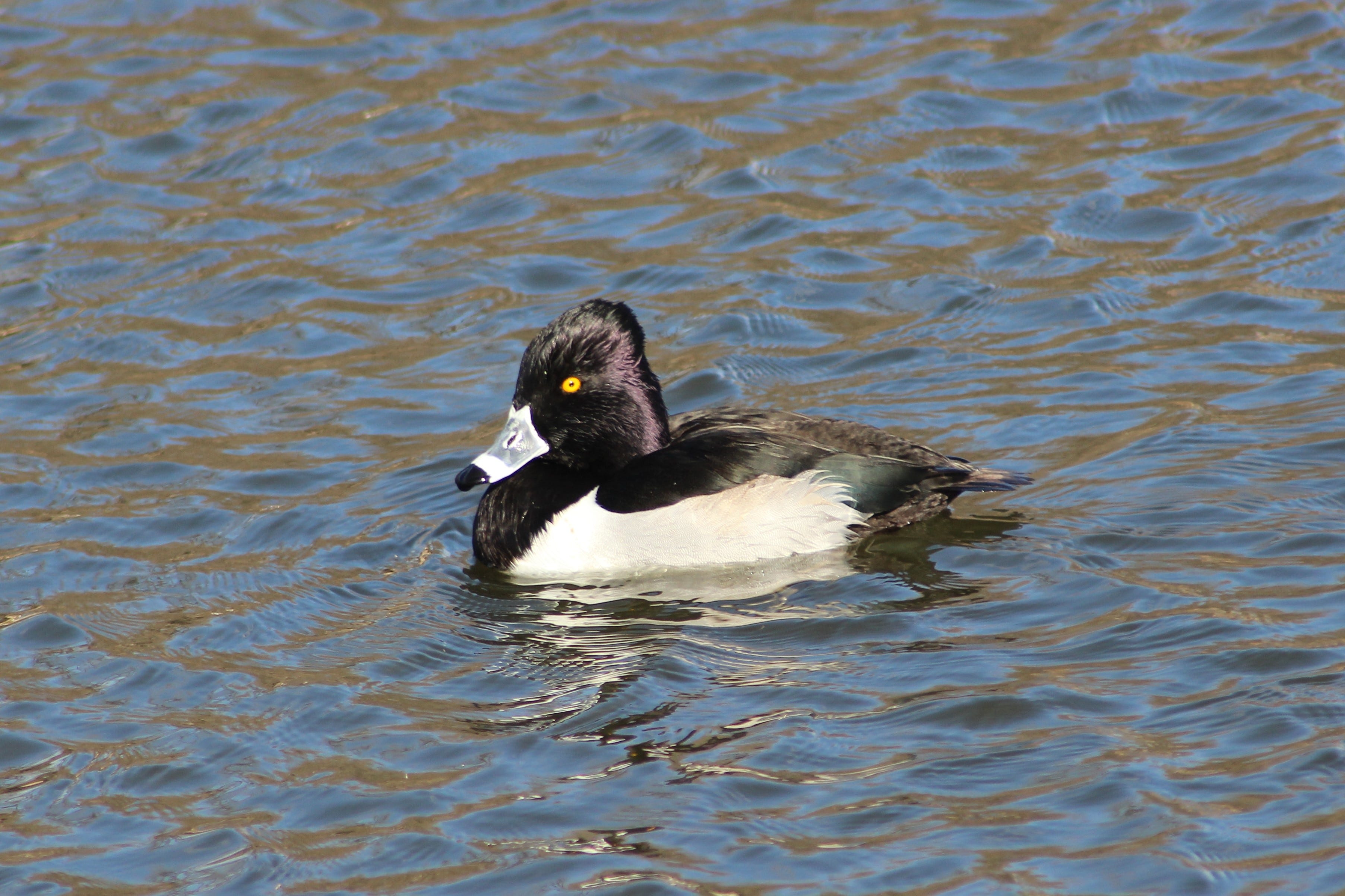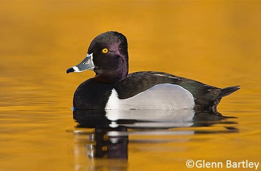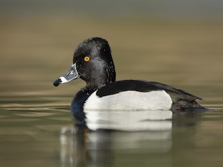 Its breeding distribution stretches from alaska south and east across canada south to the northern rockies and north dakota and across the great lakes states and northern new england. The male ring necked duck is a sharply marked bird of gleaming black gray and white. They have two white rings surrounding their gray bill a shiny black angular head black back white line on the wings a white breast and yellow eyes.