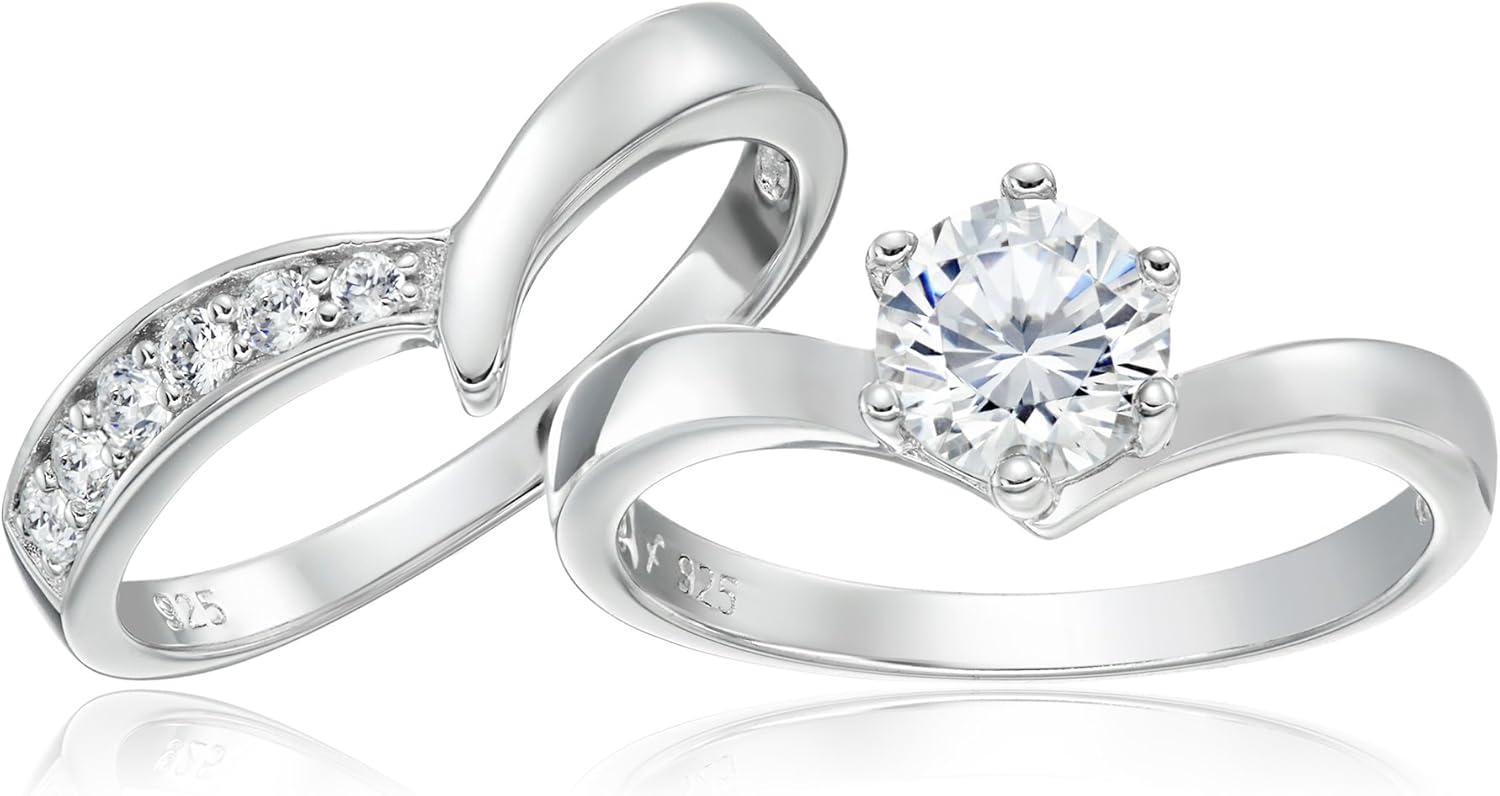Amazon Com Platinum Plated 925 Sterling Silver Aaa Cubic Zirconia Round Solitaire Ring With Chevron Band Bridal Set Size 6 9 Cttw Wedding Ring Sets Jewelry