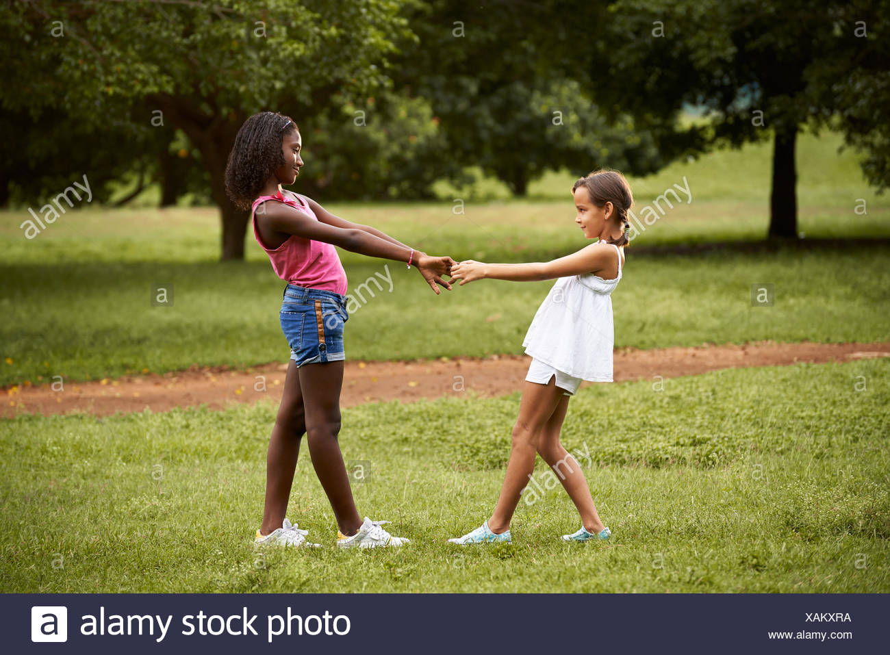 Two Hispanic And African Little Girls Playing Ring Around The Rosie In Public Park And Holding Hands Stock Photo Alamy