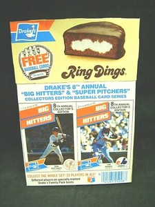 Enjoy drakes cakes ring dings or coffee cakes with your morning cup of coffee or put some drakes yodels in your kids snack for school or even snack on some devil dogs while watching tv. 5 ring dings all with the same 2 cards and 1 devil dogs flat empty box with baseball card. Another version is filled with custard and labeled boston creme pies.