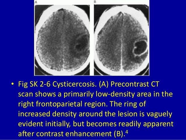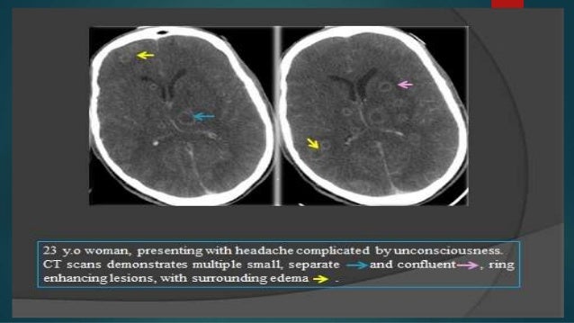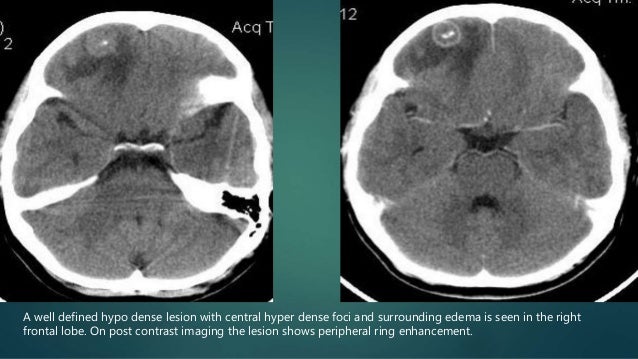 5658 magnetic resonance imaging mri and cranial computed tomography ct reveal single or multiple tumor like lesions with hypodense or hypointense centers with or. The first step is to determine whether the lesion presented on the ct scan is ring enhancing or non enhancing. If it is a ring enhancing lesion the most commonly seen etiologies are cerebral toxoplasmosis 50 primary central nervous system cns lymphoma 30 less commonly bacterial or fungal abscess eg.