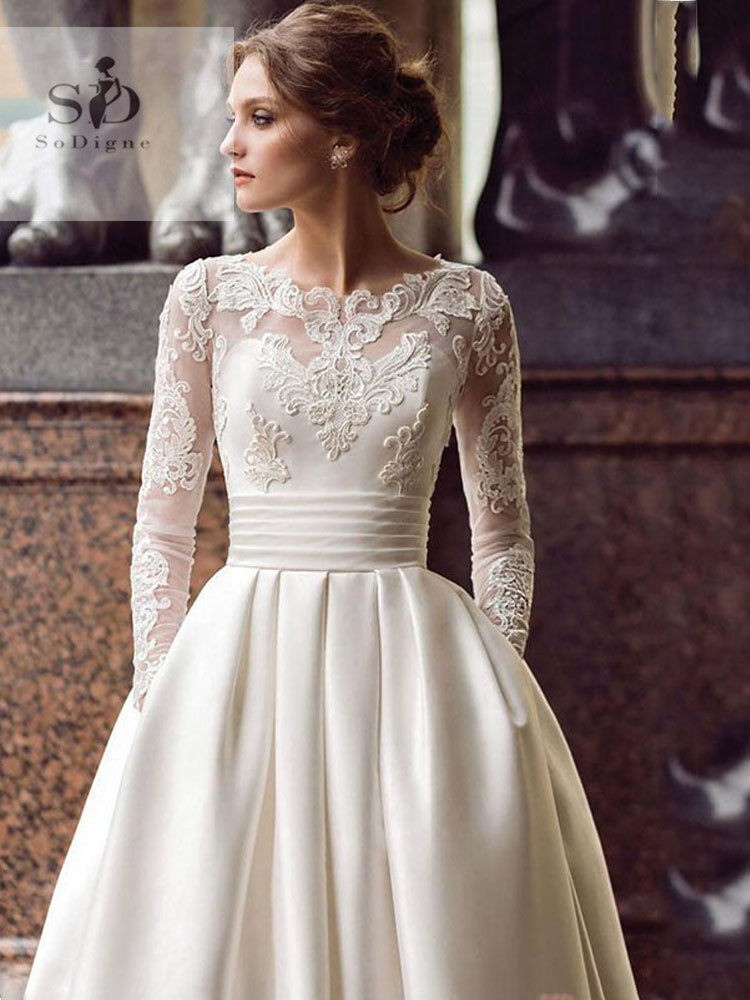 2019 July Wedding Dress Long Sleeve A Line Satin Wedding Gown With Train White Ivory Lace Appliques Bride Dresses Lazada Ph