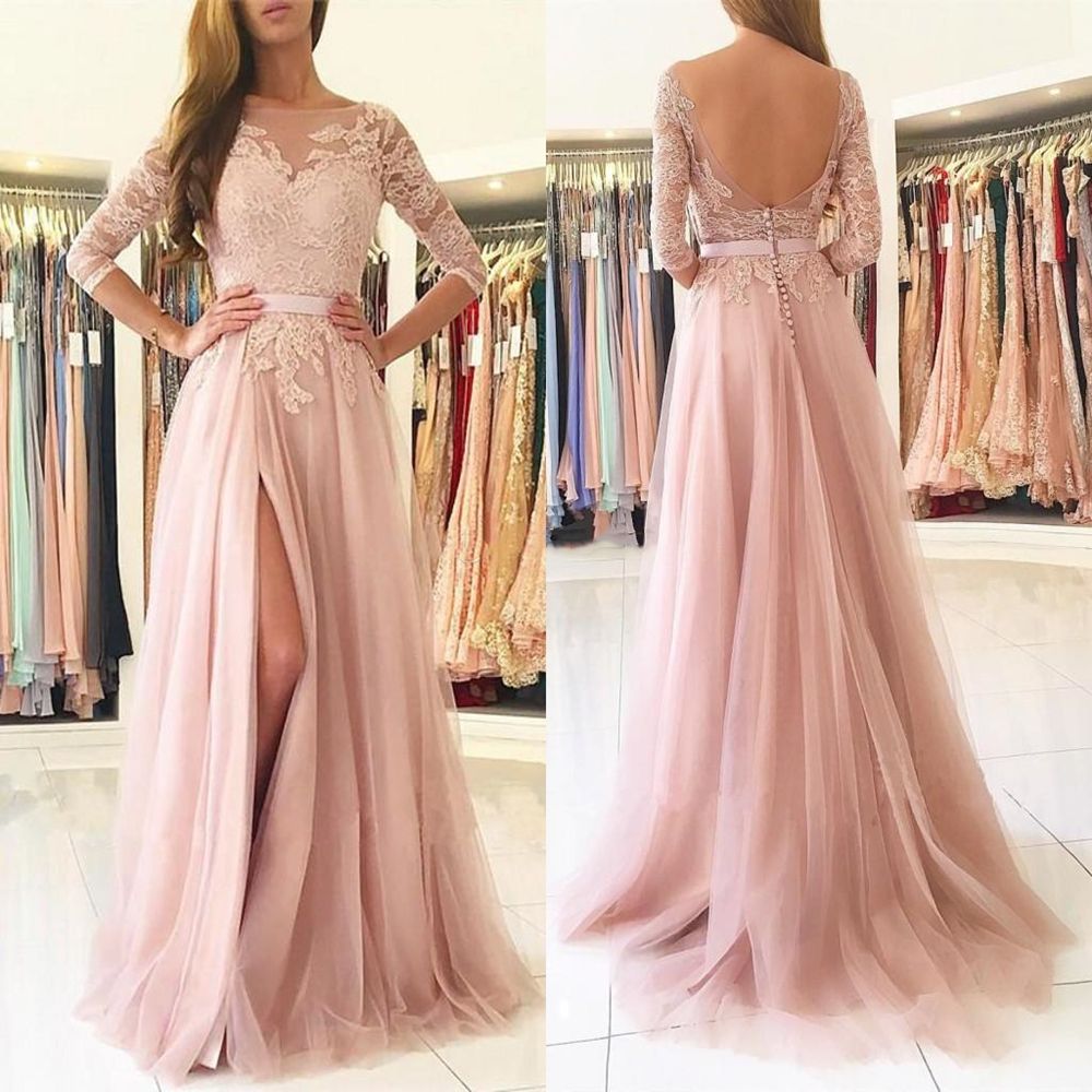 Blush Pink Split Long Bridesmaids Dresses 2019 Sheer Neck 3 4 Long Sleeves Appliques Lace Maid Of Honor Country Wedding Guest Gowns Cheap Evening Gowns Wedding Guest Dresses From Aiyawedding 91 69 Dhgate Com