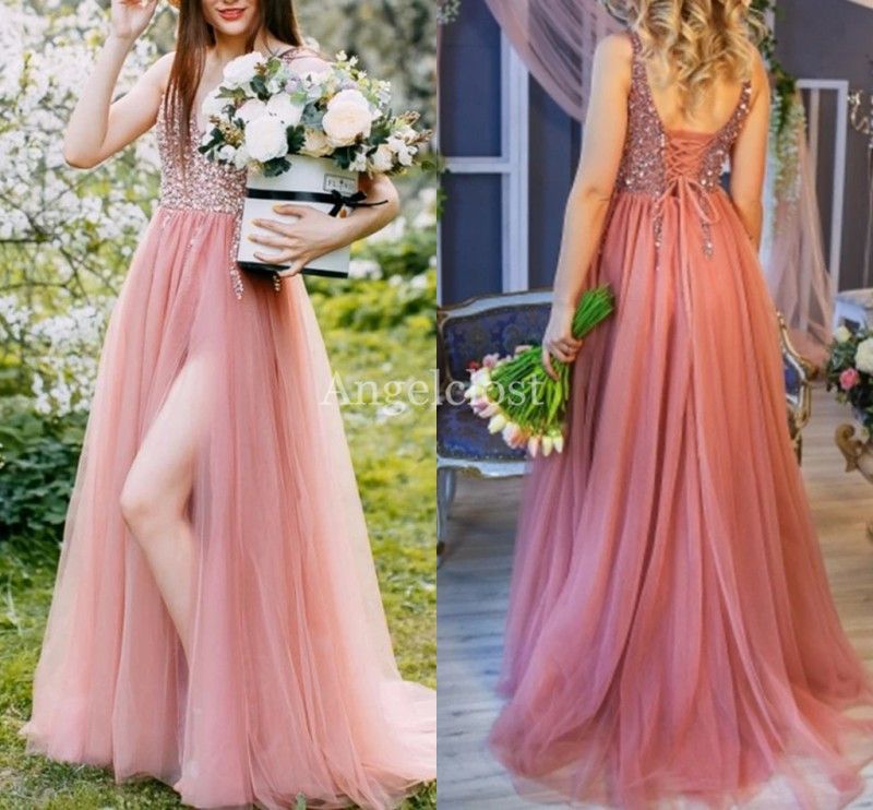 Major Beading Long Bridesmaid Dresses 2019 V Neck Lace Up Back Sweep Train Side Split Maid Of Honor Gowns Garden Beach Wedding Guest Dresses Nice Bridesmaid Dresses Orange Bridesmaids Dresses From Angelclost