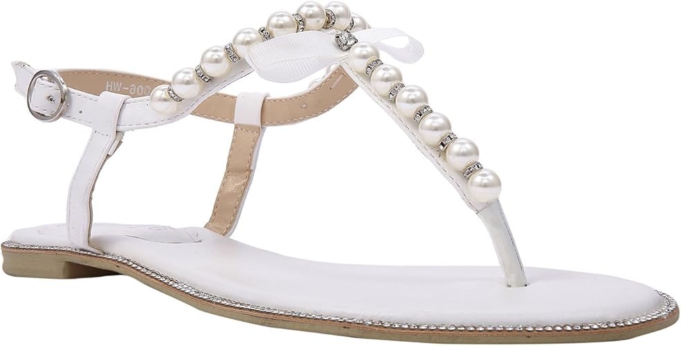 Amazon Com Shesole Women S Pearl T Strap Bridal White Flat Sandals Beach Wedding Shoes Flats