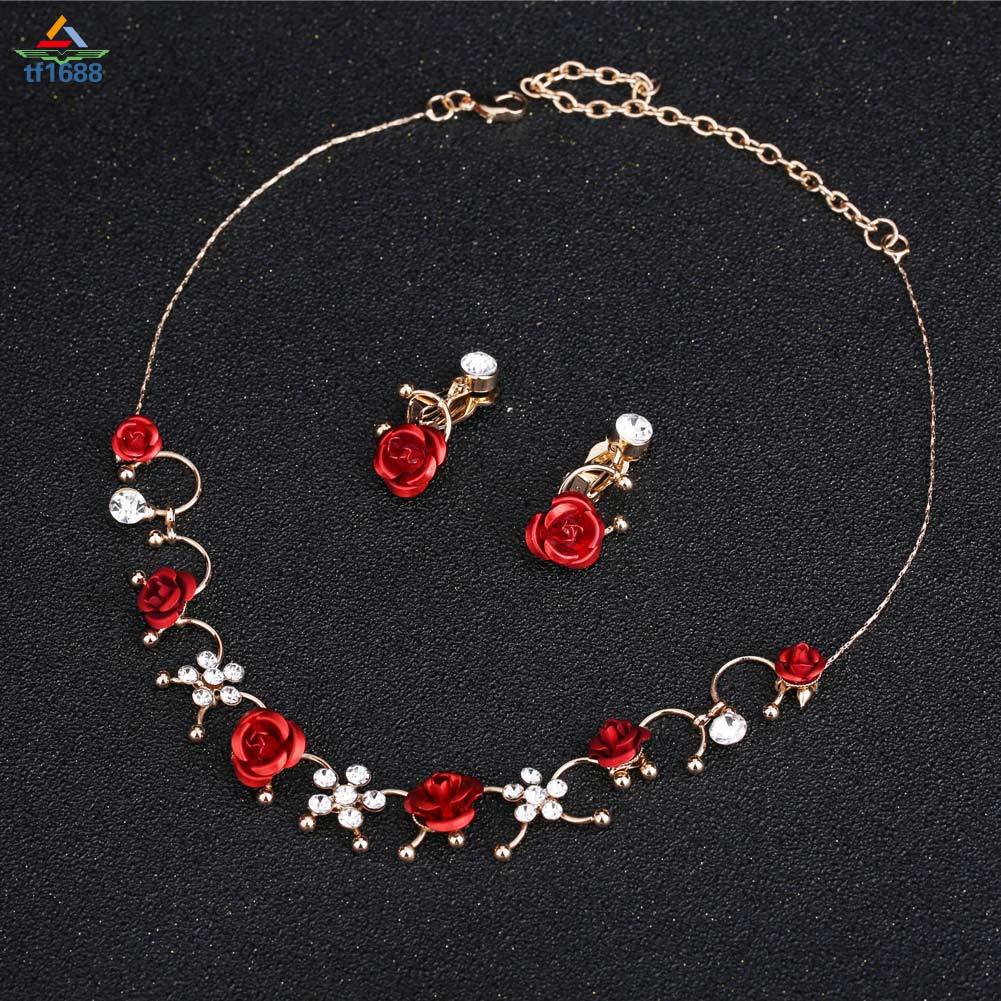 Sweet Wedding Necklace Clip Earrings Set Red Flower Decor Handmade Bride Jewelry Set Shopee Indonesia