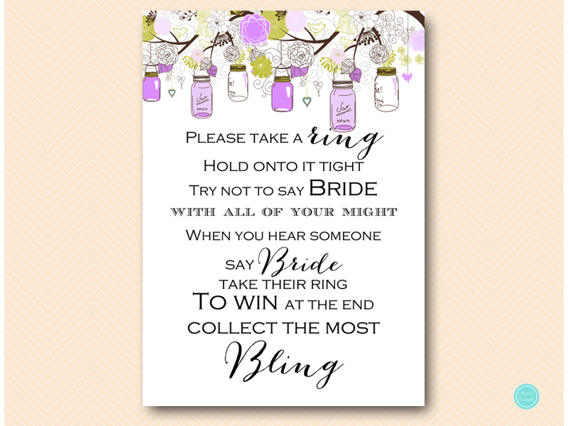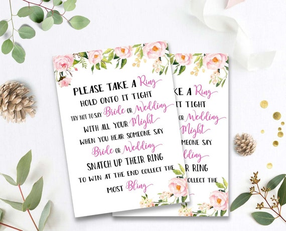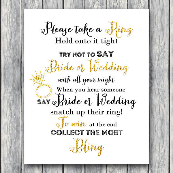 Free printable ring game sign click to download. Party guests can take another guests ring when they catch them saying bride or dress. One ring isnt enough.