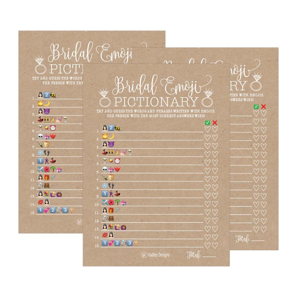 Wedding emoji game. It is a simple game with a modern twist. A fun twist on traditional pictionary guests must correctly decipher the wedding words and phrases using emojis updated with the new emoji icons. Check the movie knowledge of your bridal shower party guests with this original emoji pictionary quiz.