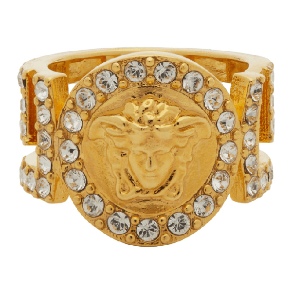 Buy versace women's metallic icon medusa crystal ring. All versace jewelry products are lead and nickel free. Carved ring featuring the iconic medusa embellished with stunning swarovski crystals swarovski crystals goldtone made in italy size width, about 0.4 about the brand.